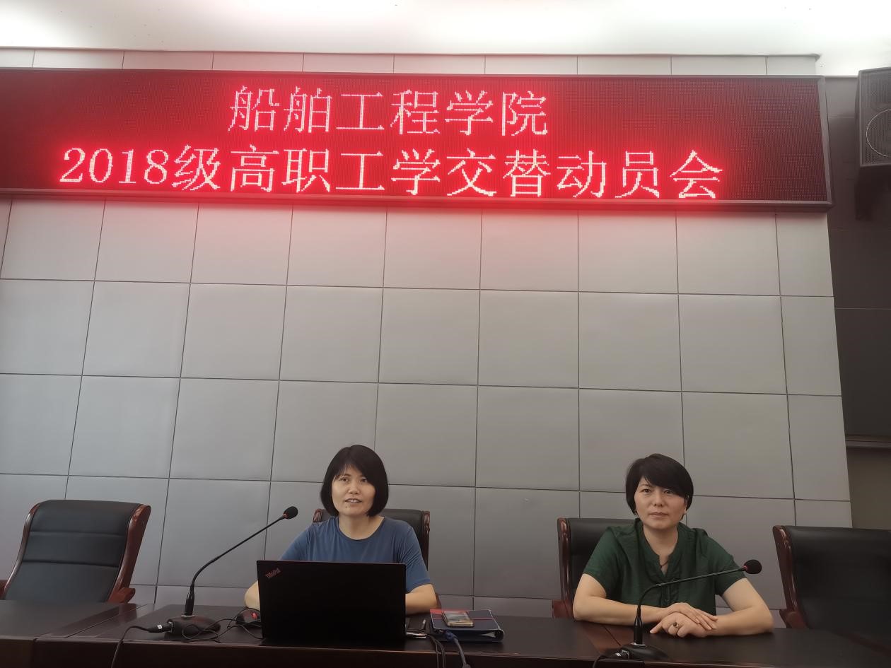 为进一步做好2018级高职学生工学交替的动员工作,明确学生工学交替前各项准备,保证学生顺利完成工学交替内容,6月18日,船舶工程学院在学术报告厅召开2018级高职学生工学交替动员会,学院院长吴志亚、副院长刘方、学工办老师、2018级高职全体学生参加了此次会议。