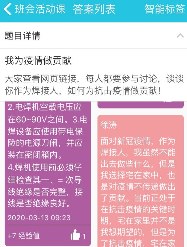 3月12日,在班主任滕老师主持下,181121班全体同学利用云班课平台召开“我为疫情做贡献”网络主题班会。滕老师通过提前发布焊接工程师者在建设火神山医院的网络报道和相关照片,让同学们展开讨论,作为焊接专业学生,我们如何为抗击疫情做贡献。