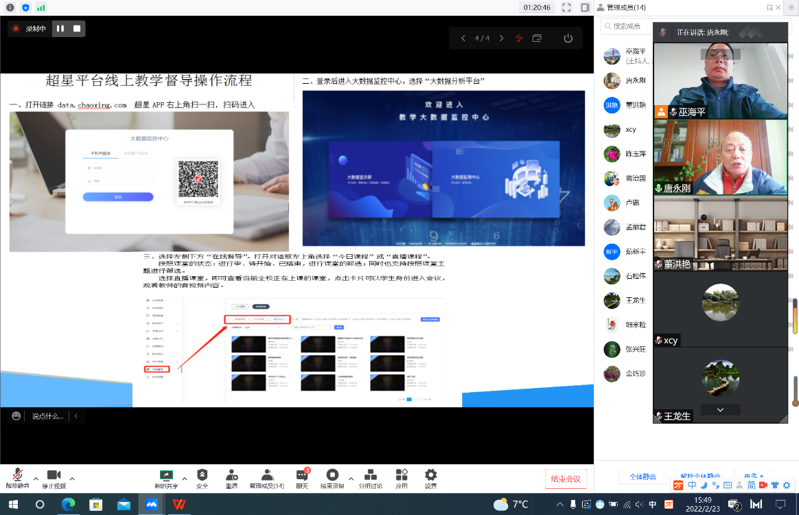 2 23日下午,学校召开2021-2022学年第二学期第一次教学督导工作例会,会议通过超星平台腾讯会议形式在线召开。17名校级督导员和发展规划处(质量管理办公室)全体人员参加会议,会议由发展规划处处长唐永刚主持。