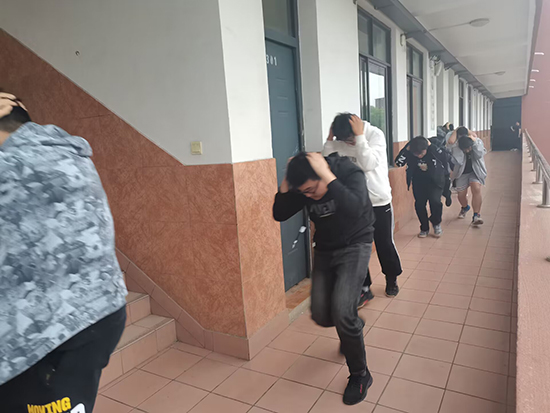 学生则按老师的要求用双手护住头颈部、蹲在课桌、讲台或承重墙的墙根、墙角底下进行应急避险。当防震警报讯号解除时,所有学生都能听从老师的指挥弯腰、护头,按照预定路线迅速撤离教室。到达安全地点后由班主任开始清点本班人数并向演练小组上报集合情况,最后由演练总指挥统计集合人数(包括教师人数),做到万无一失。整个演练过程师生各司其职、通力协作、全力以赴、妥善应对,很好的完成了本次地震避险演练。