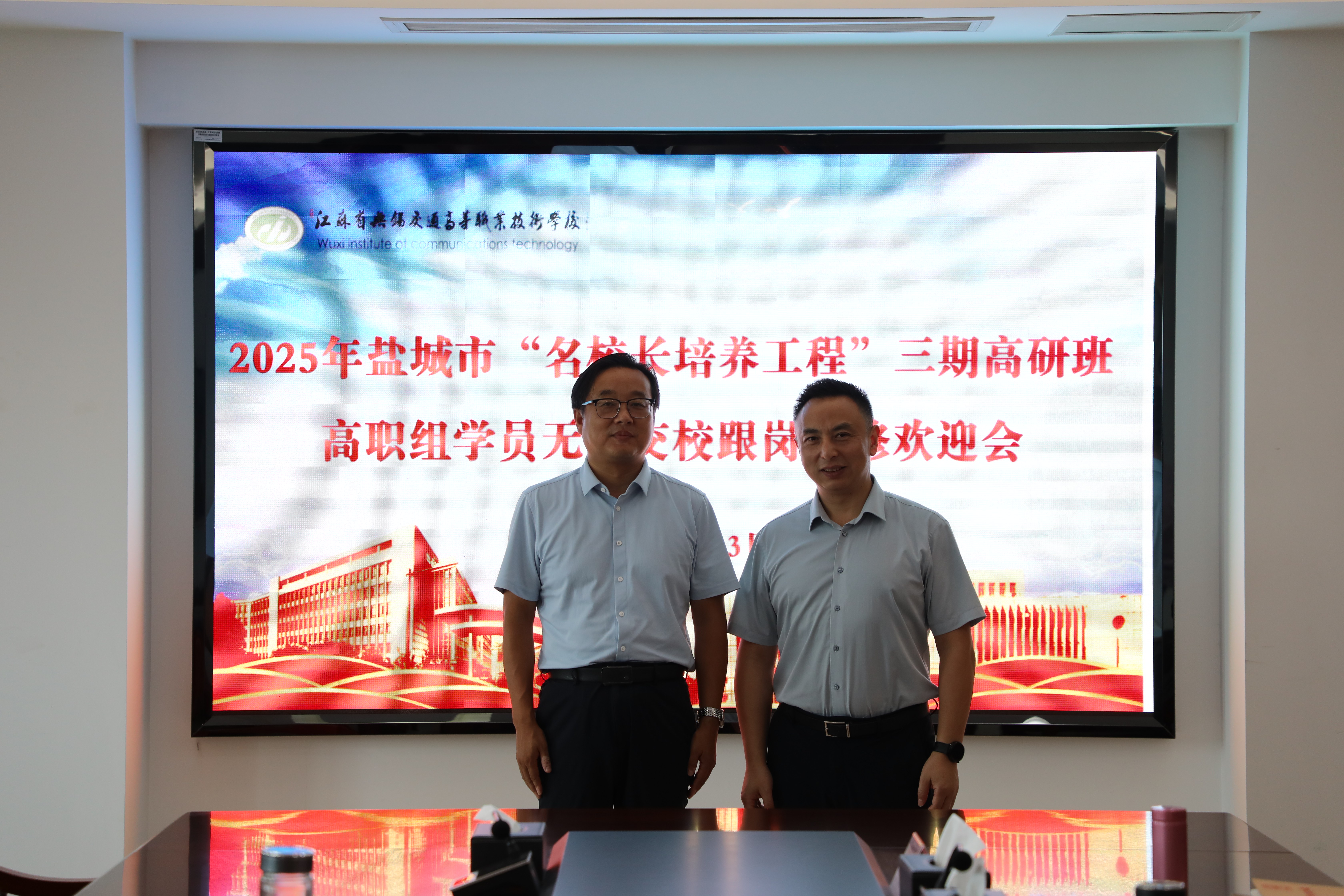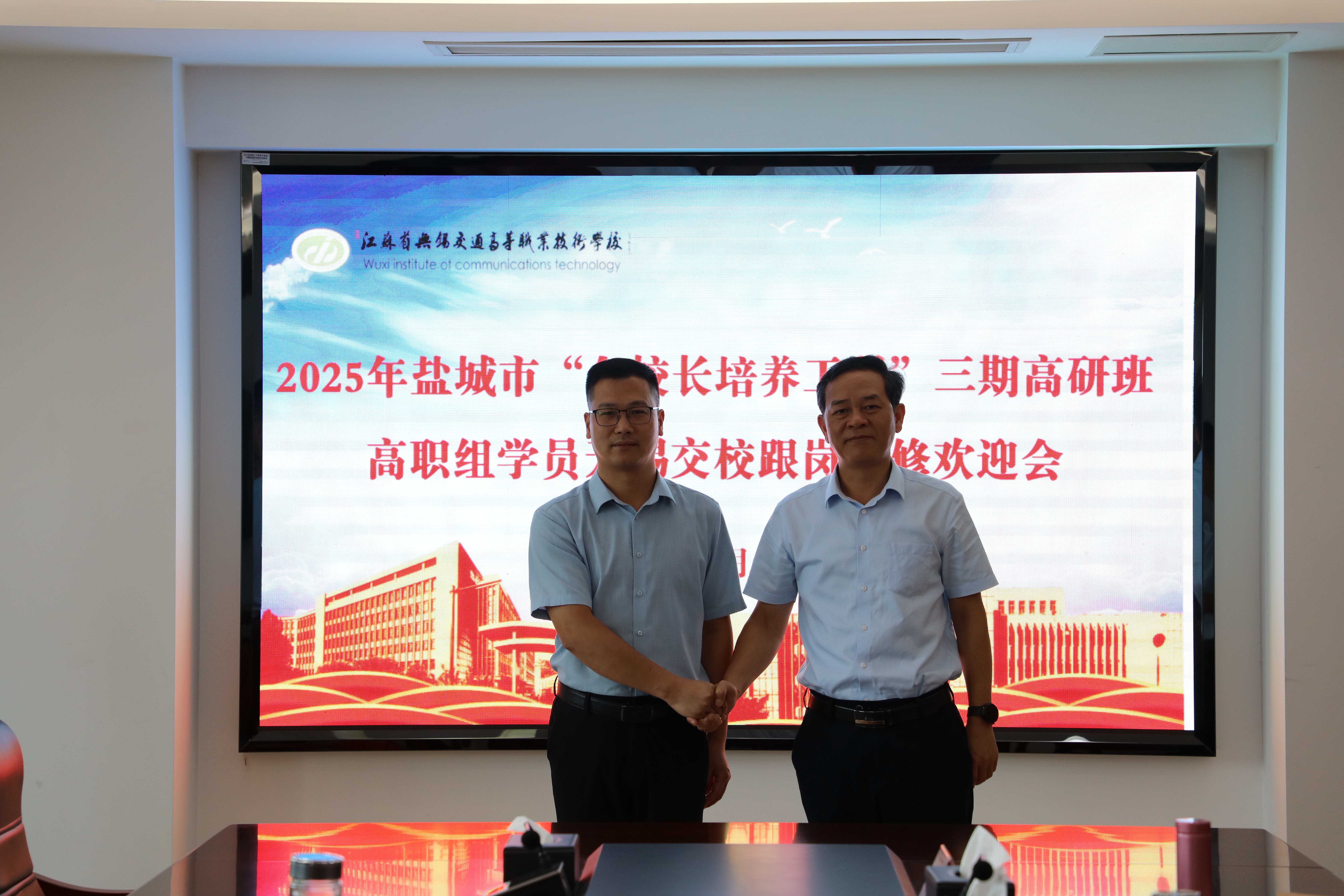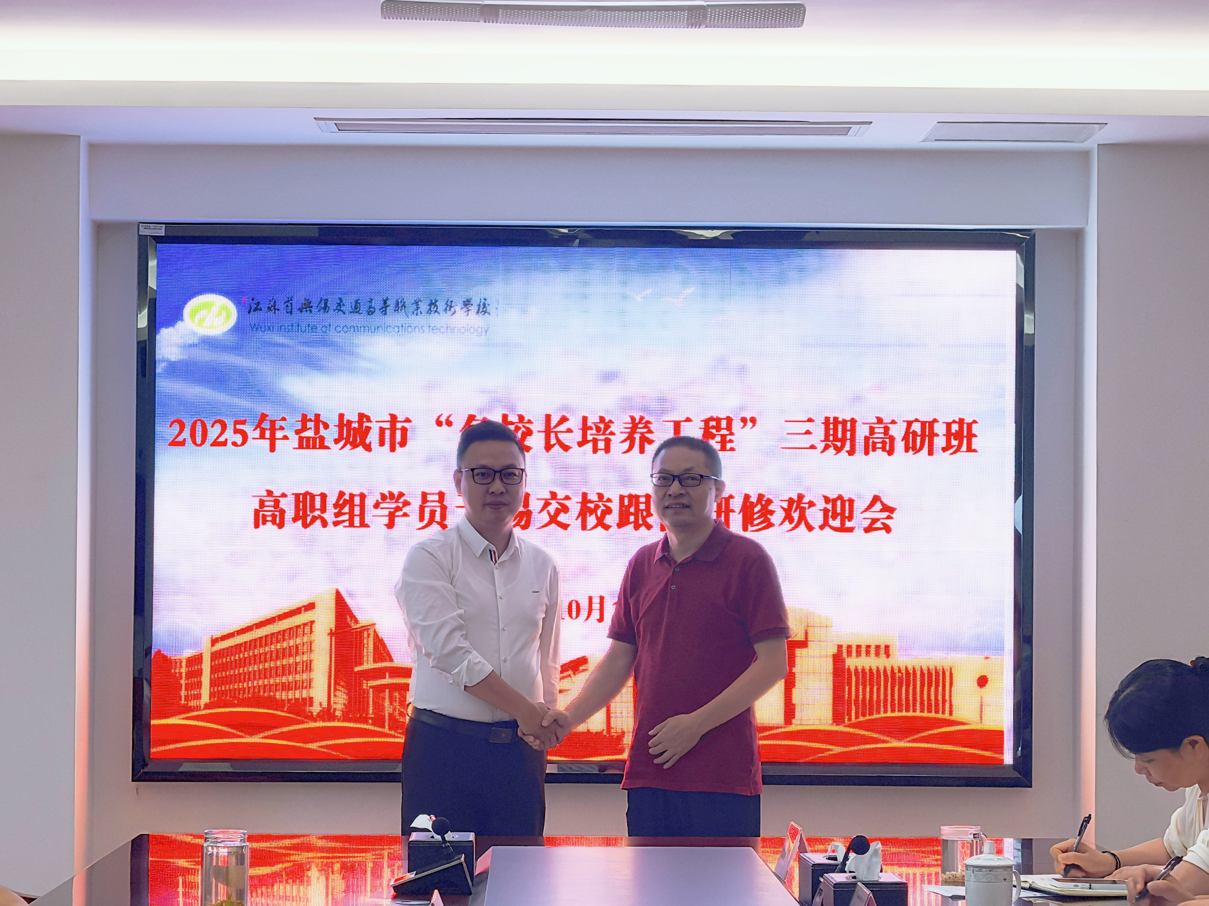根据江苏省教师培训中心和江苏教育行政干部培训中心安排,2025年10月13日上午,学校在512会议室举行盐城市“名校长培养工程”三期高研班高职组学员跟岗研修欢迎会,盐城海洋职业学校党委书记王海涛,现代服务系党支部书记、主任卞鹏和盐城机电高等职业技术学校副校长祁玉洲等3名跟岗学员参加欢迎会,学校党委书记李进、校长耿兴华、副校长范次猛出席会议,相关职能部门负责人和院部负责人参加会议,会议由范次猛副校长主持。