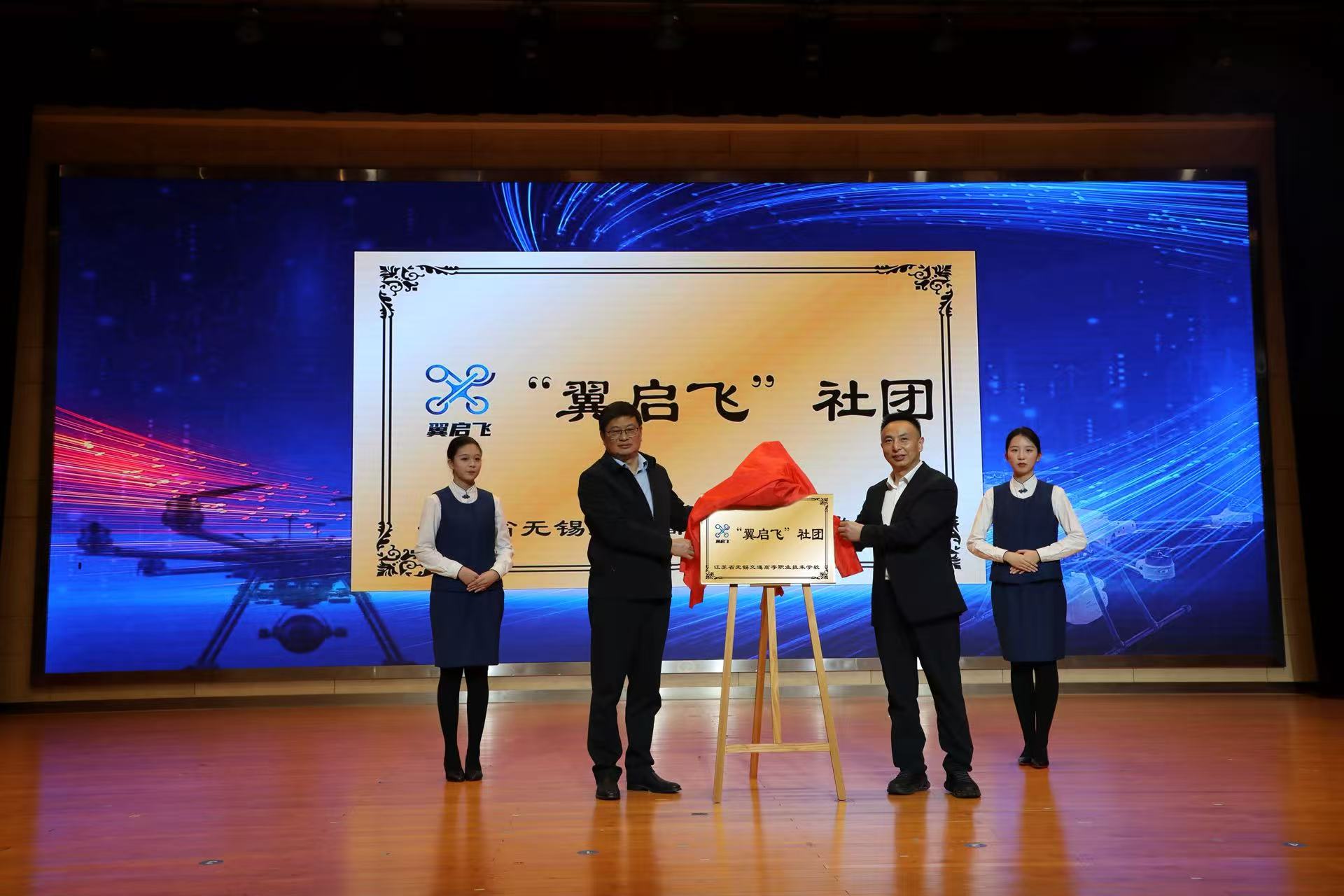 无锡市交通运输局副局长刘永强、学校党委书记李进为学校“翼启飞”无人机社团揭牌,为青年学生搭建无人机技术探索与航空梦想实践平台。