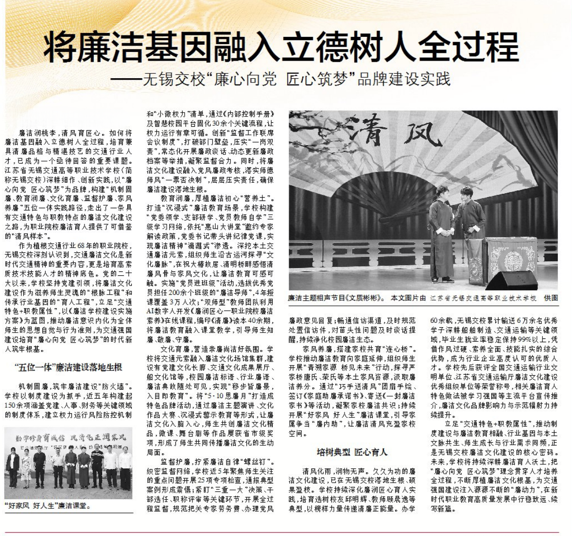 中国交通报:将廉洁基因融入立德树人全过程 ——无锡交校“廉心向党 匠心筑梦”品牌建设实践