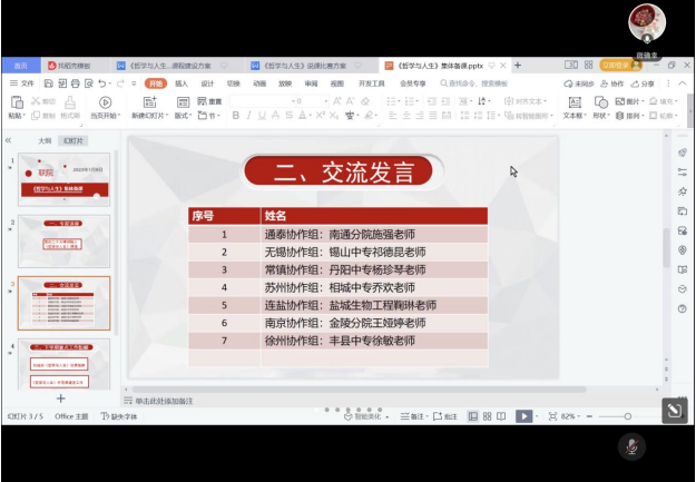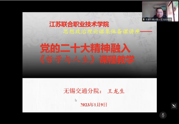 第二阶段组内所有办学单位《哲学与人生》校级集体备课牵头人集体备课无锡交通分院王龙生教授作题为党的二十大精神融入《哲学与人生》课程教学的专题讲座,各协作组代表就《哲学与人生》课程教学进行交流发言张海滨副教授对下学期《哲学与人生》集体备课重点任务进行了部署