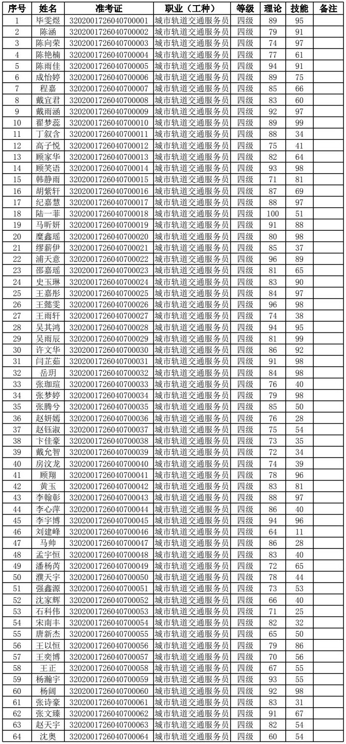 2026年4月7日,64名学生参加城市轨道交通服务员四级技能等级认定考试(考试批次2026-32020017-00009),共计36名成绩获得合格。现将考试成绩公示如下: