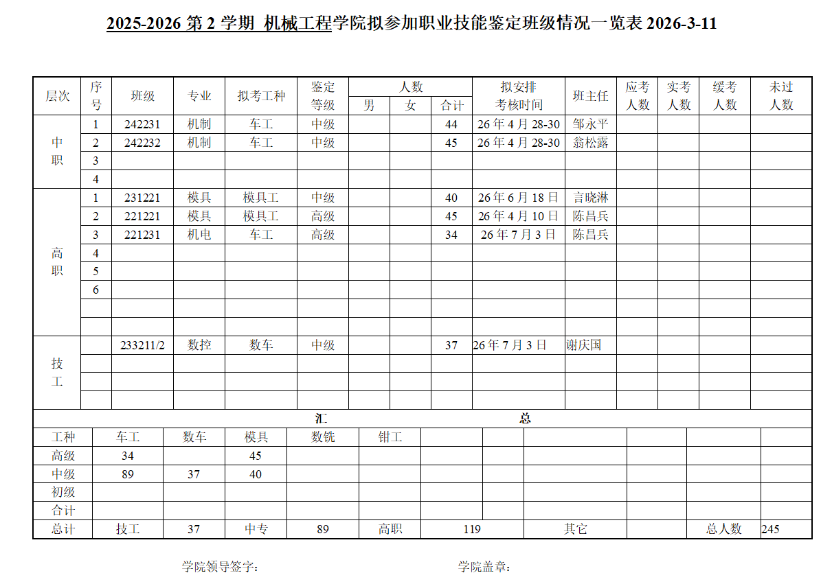 2025-2026第2学期技能鉴定计划表