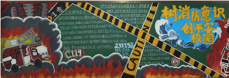 学院组织各班级以"消防安全"为主题设计黑板报,通过图文并茂的形式展示消防安全、逃生技巧及消防器材使用方法。经评比,2024级新能源汽车技术3班等6个班级获评一二三等奖。