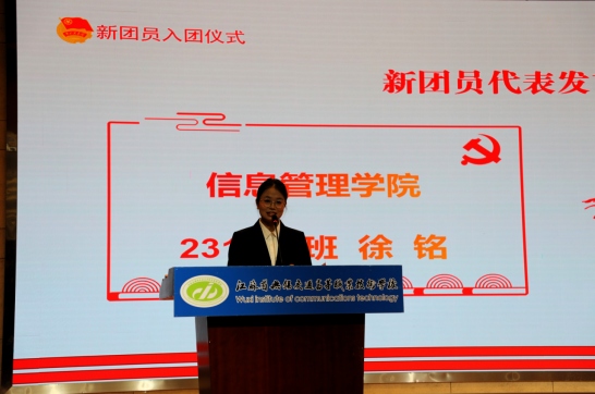 物流管理学院尹娜同学和信息管理学院徐铭同学作为新团员代表发言,她们表示将以此次入团为契机,坚定理想信念,不断追求进步,以更高标准要求自己,以实际行动践行入团誓言,为学校的发展和社会的进步贡献自己的青春力量。