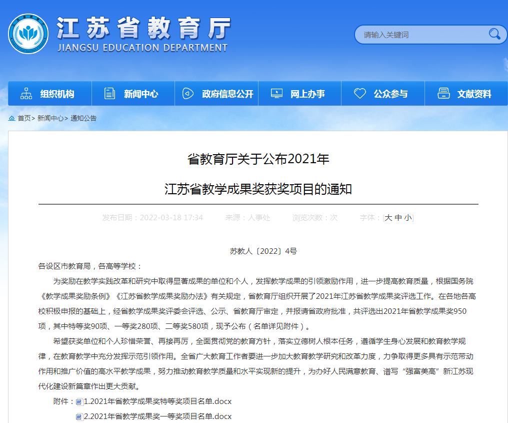 近日,江苏省教育厅公布了2021年江苏省教育教学成果奖获奖项目,学校获得省级教学成果奖3项,其中一等奖1项、二等奖2项,获奖数量和等级均创学校历史新高。