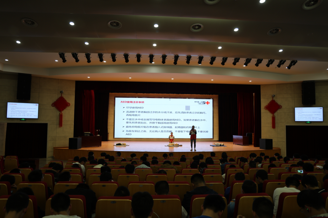活动初始,红十字会培训老师向师生们介绍了红十字会的起源发展、工作职责、标志及“人道、博爱、奉献”的红十字会精神,使同学们对红十字会有了初步了解。随后,红十字会培训老师结合理论知识和实际救护技巧对生活中遇到突发状况急救、徒手心肺复苏、溺水紧急救护等内容作了详细的讲解。为了使师生们更加深入的了解各项救护技巧、掌握心肺复苏要领、培训老师和师生们在现场展开了深入互动,对心肺复苏进行了实操演练、手把手向同学们传授了急救手法和注意事项。