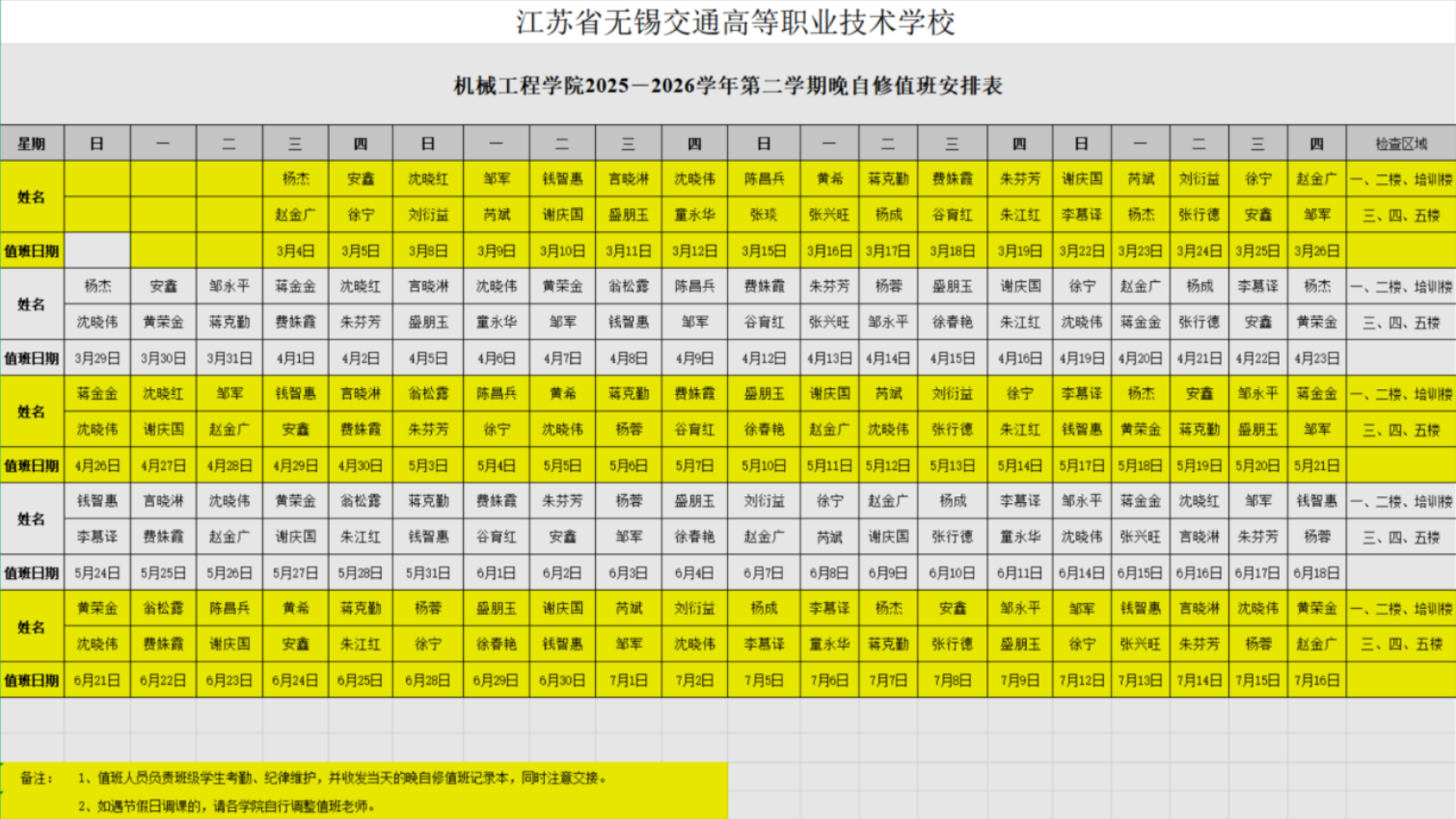2025-2026学年第二学期晚自习辅导安排表