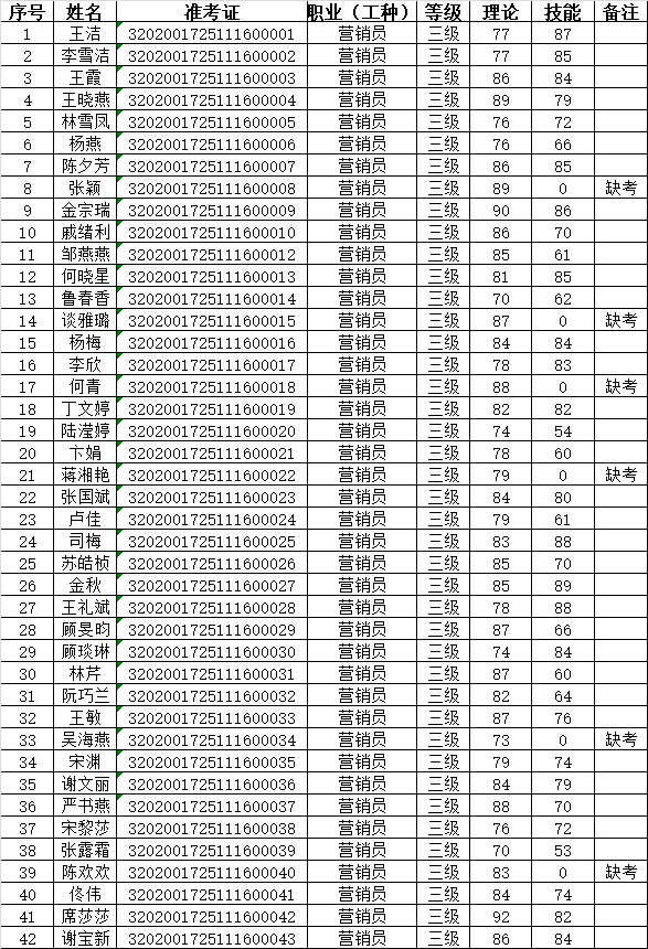 2025年11月16日,42名企业人员参加营销员三级技能等级认定考试(考试批次:2024-32020017-00040),共计34名成绩获得合格。现将考试成绩公示如下: