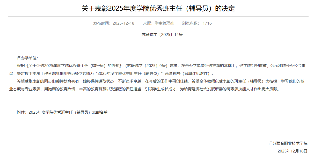 在刚刚揭晓的江苏联合职业技术学院2025年度学院优秀班主任(辅导员)名单中,无锡交通分院11位老师凭借其出色的班级管理能力和无私的育人情怀,在思想引领、学业指导、生涯规划教育等方面表现突出,荣获江苏联合职业技术学院“优秀班主任”荣誉称号!
